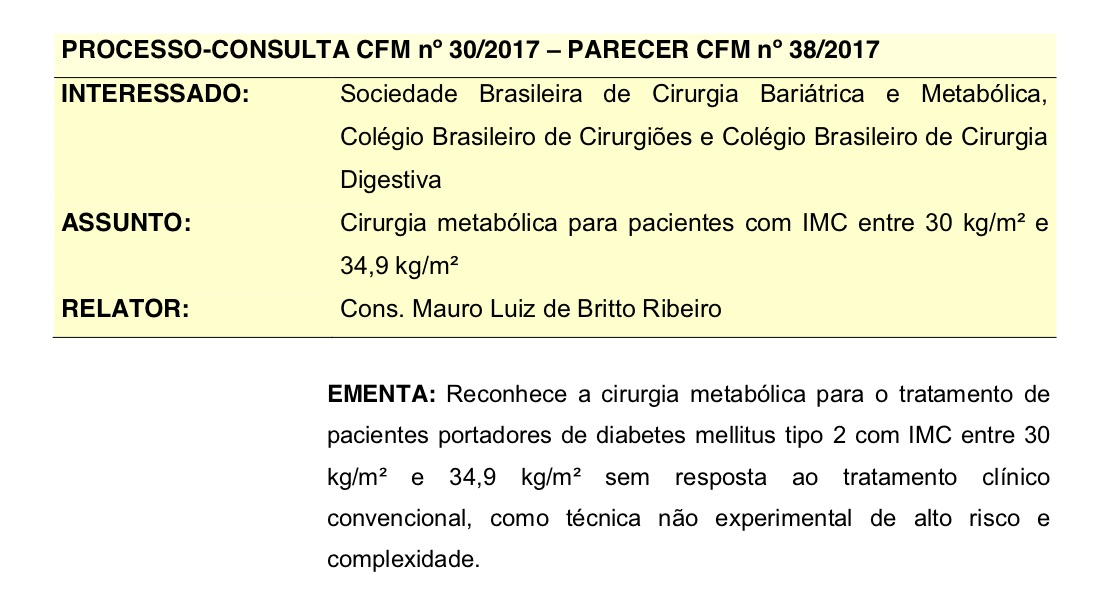 Reconhece a cirurgia metabólica para o tratamento de pacientes portadores de diabetes mellitus tipo 2 com IMC entre 30 kg/m² e 34,9 kg/m² sem resposta ao tratamento clínico convencional, como técnica não experimental de alto risco e complexidade.